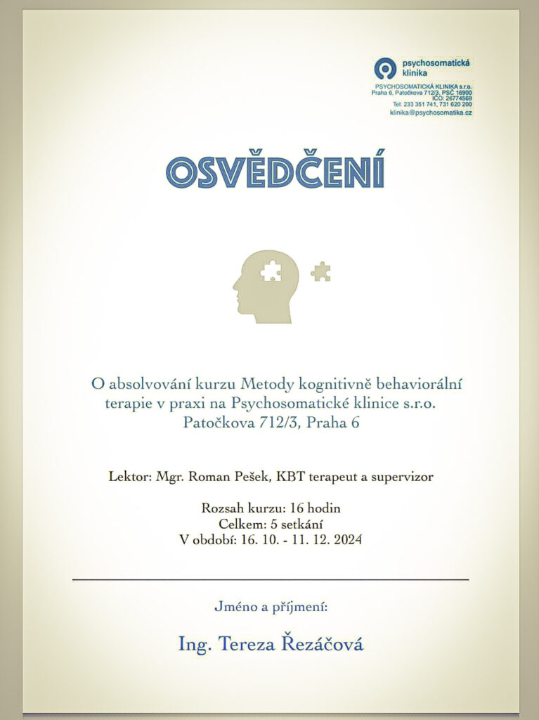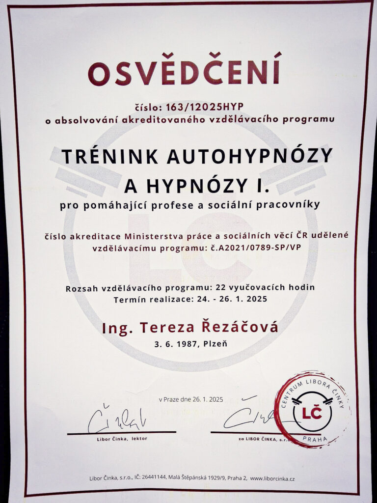 Vše výše uvedené postupně zintenzivňovalo můj zájem o lidskou individualitu, jedinečnost a potenciál, což mě přivedlo k dalšímu prohlubování vědomostí v rámci psychologie, filozofie, sociologie, antropologie a jiných pro mou praxi relevantních disciplín a oborů. V tomto ohledu na mě měly velký vliv zejména metody kognitivně behaviorální terapie, hypnoterapie a imaginace, které se využívají v terapiích s různými úzkostnými potížemi (generalizovaná úzkostná porucha, panická porucha, agorafobie, sociální fobie, nadměrné obavy o zdraví, OCD a další) a úzkostně depresivními problémy.